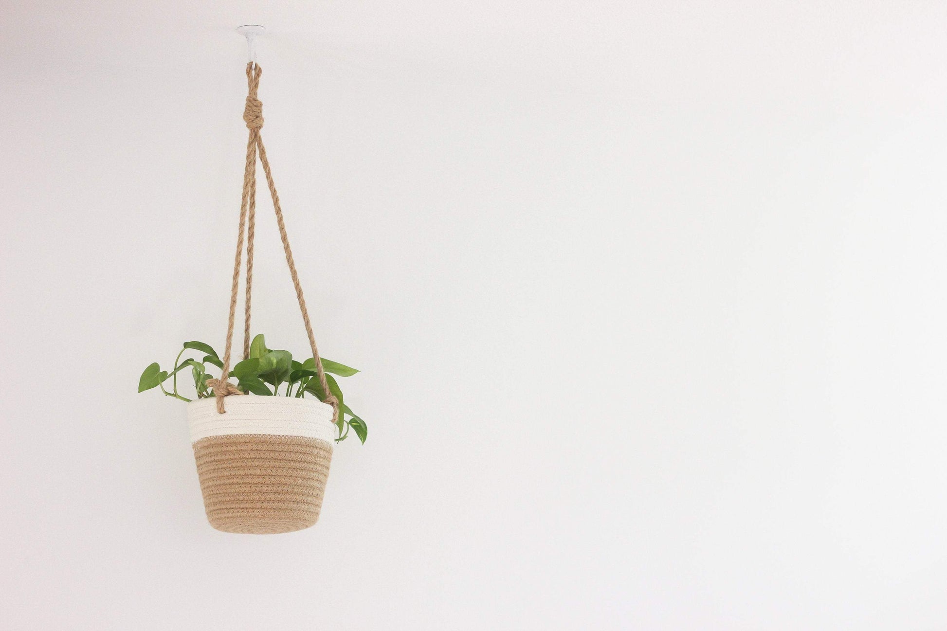 This medium beige and white cotton rope basket makes for a modern, soft-to-the-touch hanging planter. Plastic lining included to protect the basket.