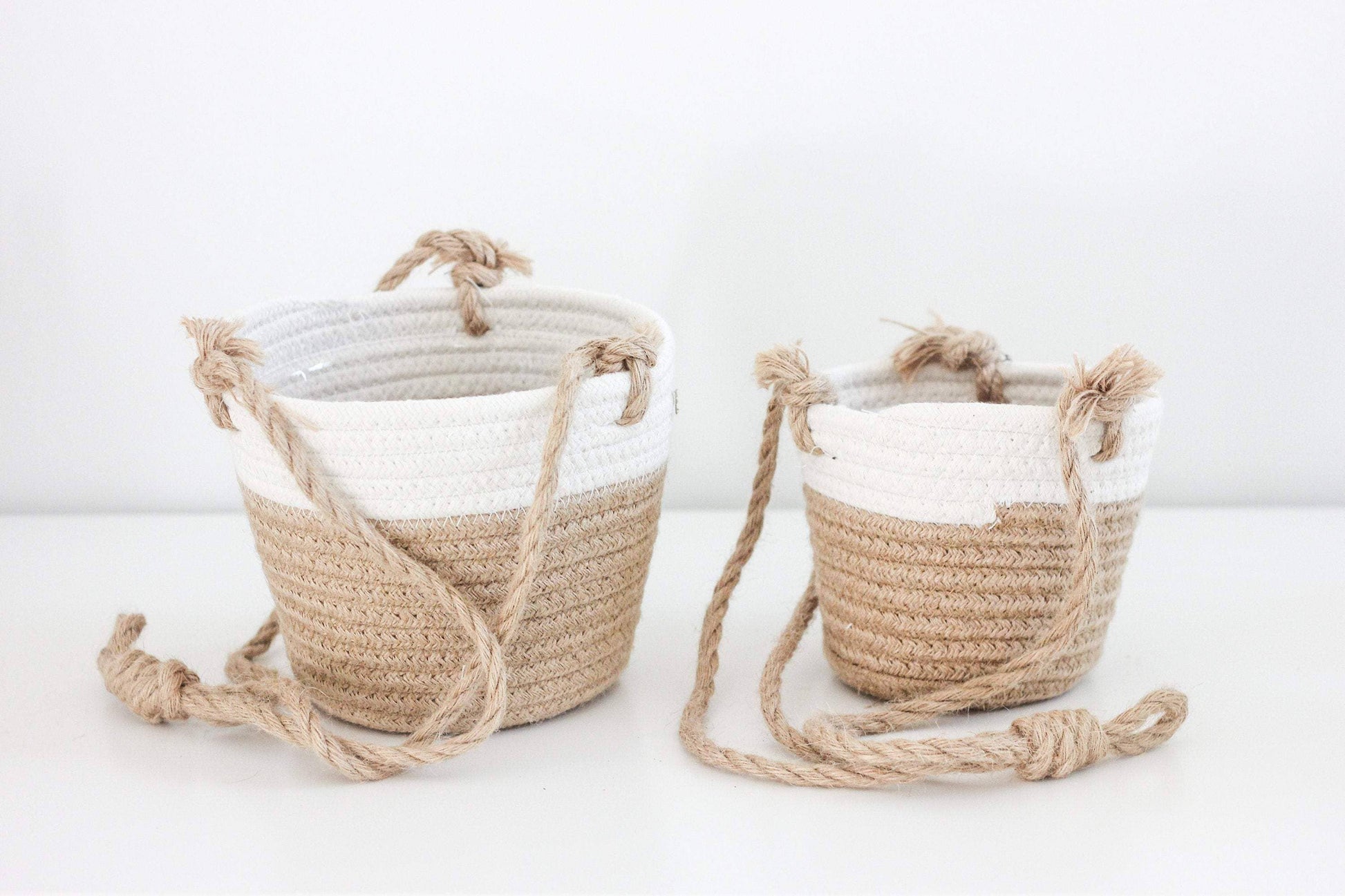 Medium Beige and White Cotton Rope Hanging Planter Basket: 5"