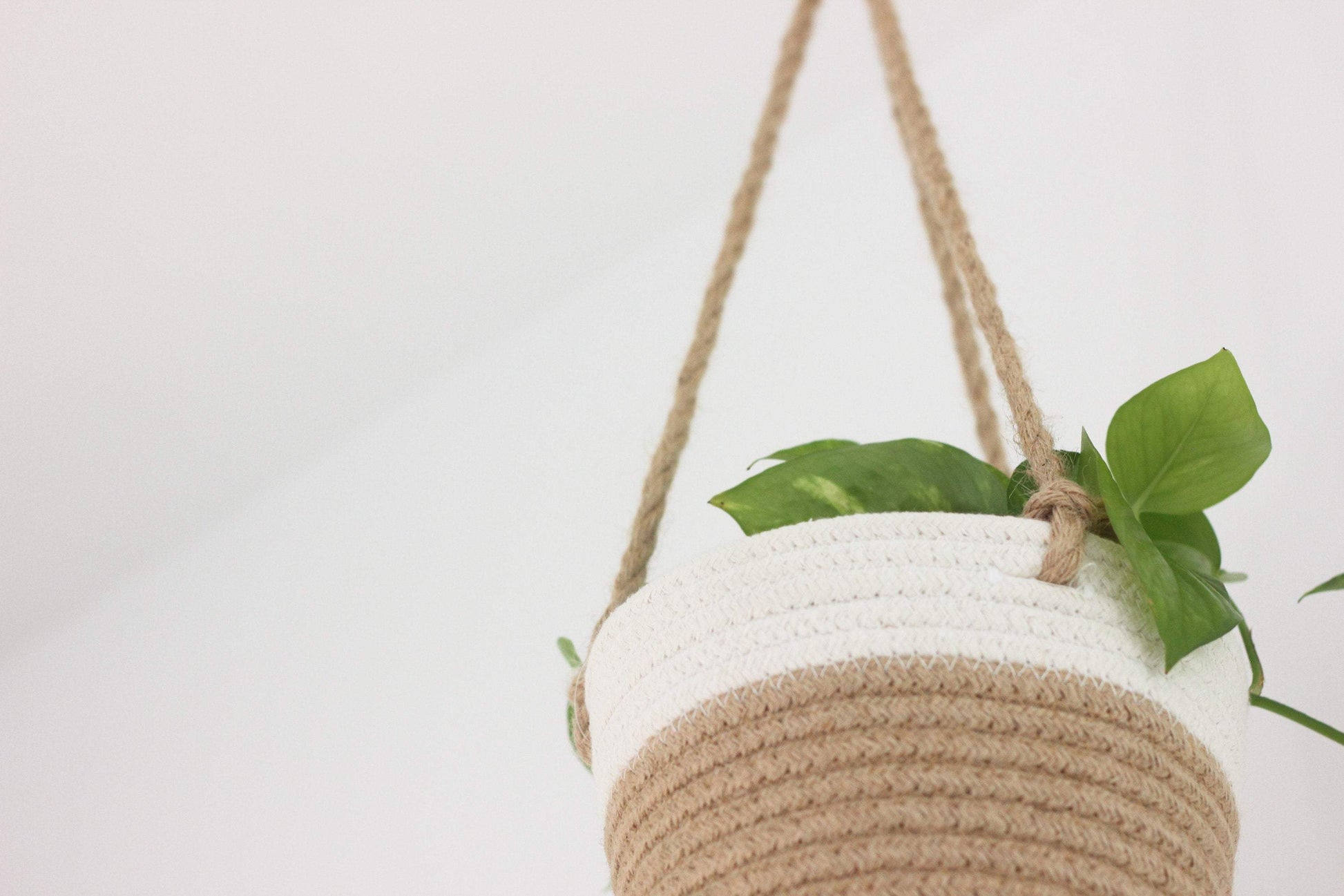 This medium beige and white cotton rope basket makes for a modern, soft-to-the-touch hanging planter. Plastic lining included to protect the basket.