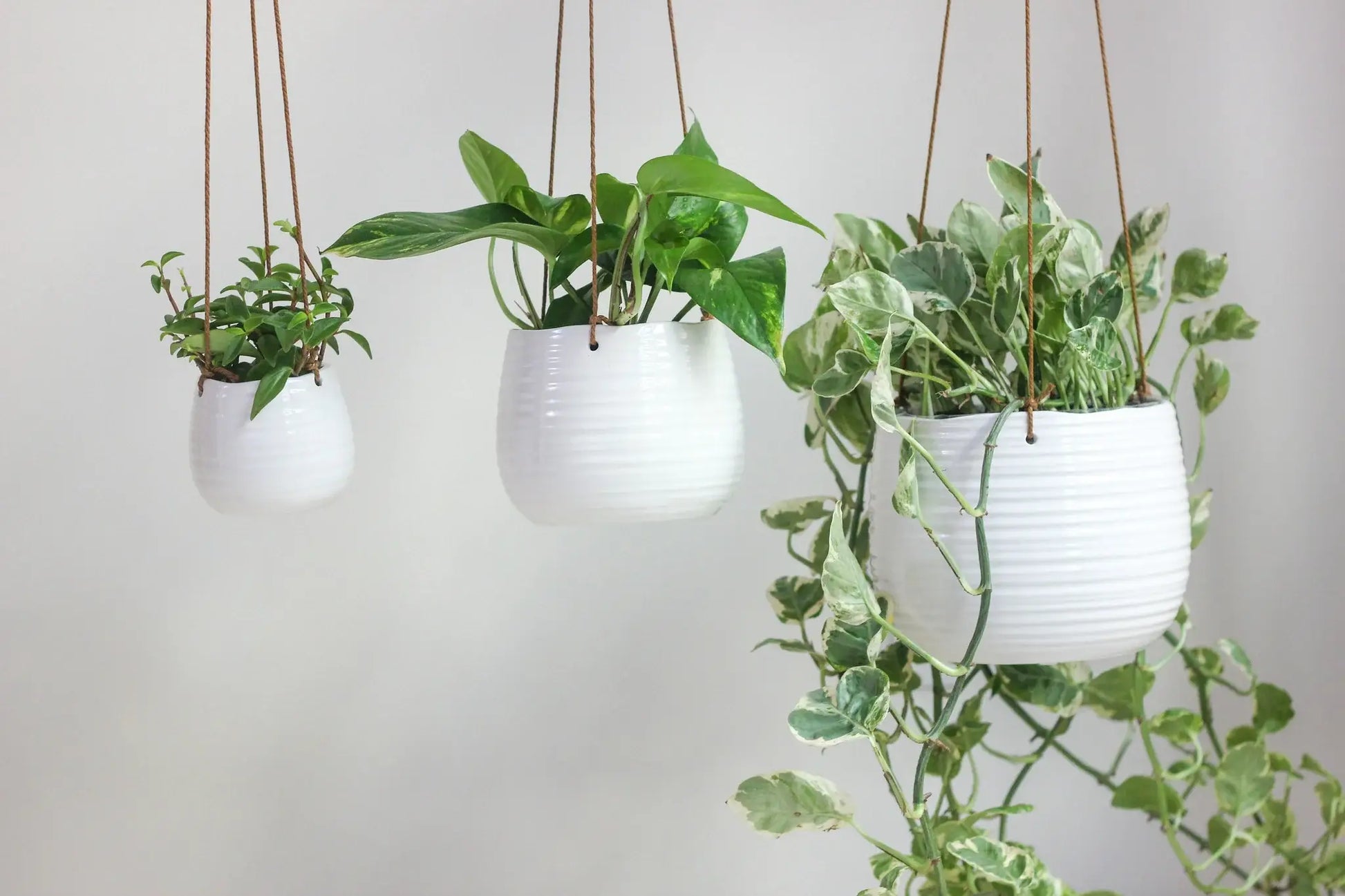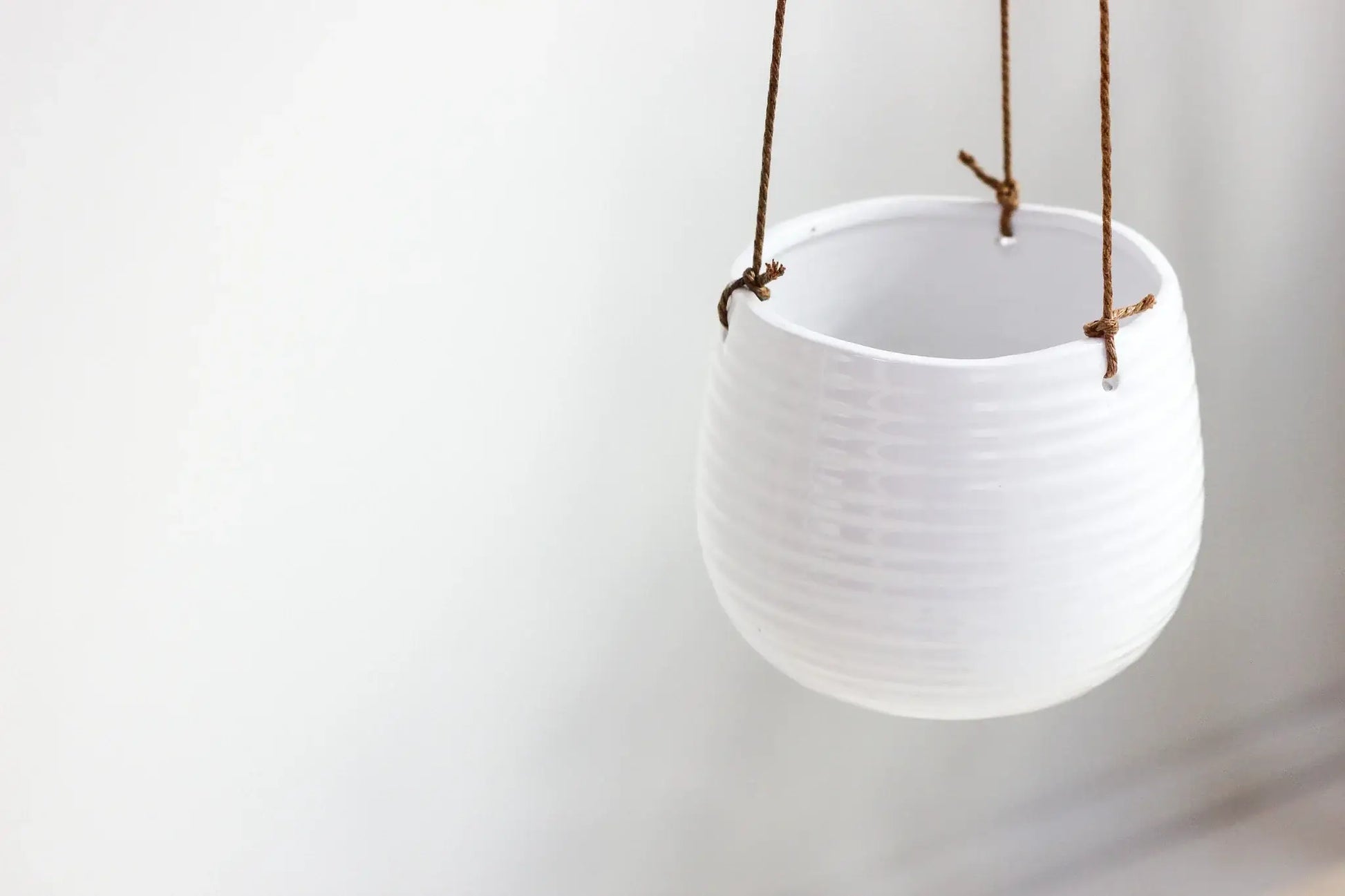 Small Ribbed Glossy White Ceramic Hanging Planter Pot: 5.5